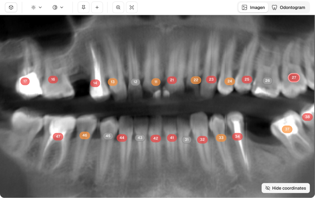 Dentomo se ha entrenado con una amplia base de datos de imágenes de tomografía computarizada de haz cónico (CBCT), lo que le permite ofrecer una precisión sin igual en la identificación y clasificación de más de 10 patologías dentales críticas, además de un análisis exhaustivo de más de 14 tratamientos previos. Nuestra última versión va más allá de la simple detección, ya que introduce un editor con intervención humana y un módulo de estadísticas diseñado para la gestión clínica a escala empresarial. Dentomo ahora ofrece un control de diagnóstico total, lo que permite a los médicos refinar los hallazgos de IA y realizar un seguimiento del rendimiento organizacional con una precisión basada en datos.